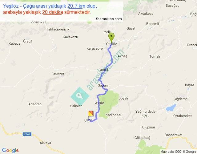 Yeşilöz - Çağa arası yaklaşık olarak 90 km/h ile yukarıda belirtilen sürede olup, iki yerin kuş uçuşu uzaklığı (mesafesi) 15'dir. Yolculuk otobüsle 26 dakika sürmektedir.