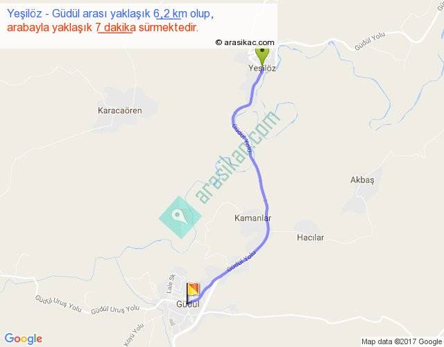 Yeşilöz - Güdül arası yaklaşık olarak 90 km/h ile yukarıda belirtilen sürede olup, iki yerin kuş uçuşu uzaklığı (mesafesi) 5'dir. Yolculuk otobüsle 9 dakika sürmektedir.