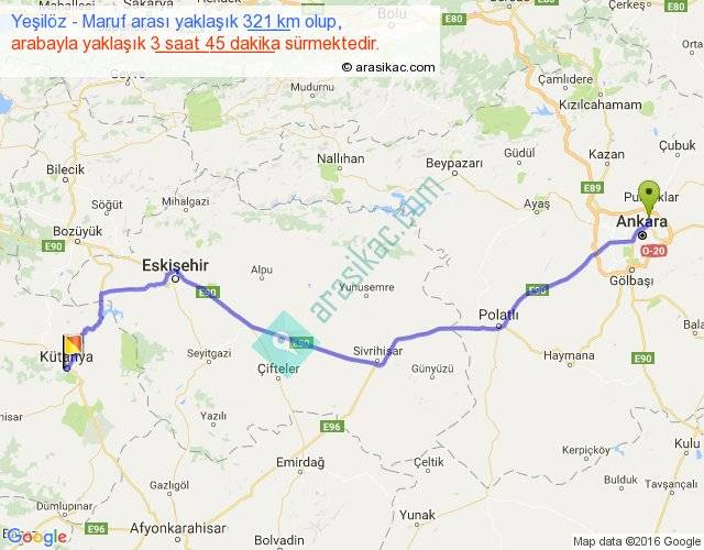 Yeşilöz - Maruf arası yaklaşık olarak 90 km/h ile yukarıda belirtilen sürede olup, iki yerin kuş uçuşu uzaklığı (mesafesi) 256'dir. Eğer belirtilen yerler arasında uçak seferi var ise bu süre uçakla 23 dakika'ya kadar düşebilir. Yolculuk otobüsle 4 saat 52 dakika sürmektedir.
