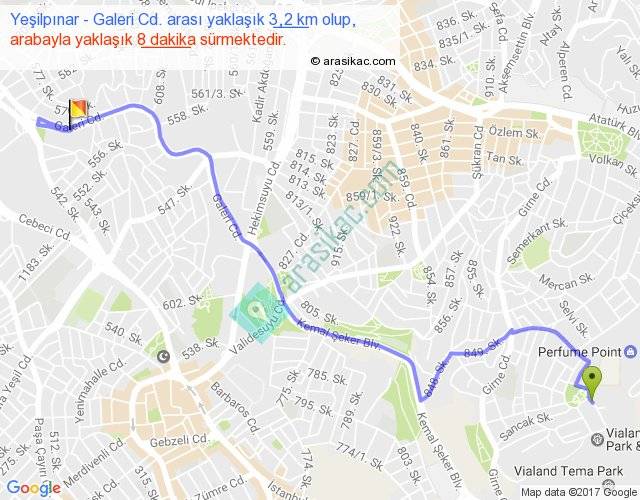 Eğer Yeşilpınar Galeri Cd. arası ne kadar yakar (benzin/mazot) diyorsanız, kilometrede 3 ₺ yakan bir aracınız var ise 9, km'de 4 ₺ yakan bir aracınız var ise 12, km'de 5 ₺ yakan bir aracınız var ise 15 ile bu yolculuğu tamamlayabilirsiniz.