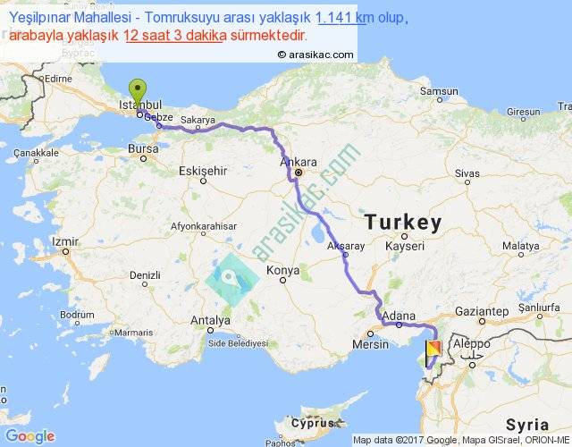 Yeşilpınar Mahallesi - Tomruksuyu arası yaklaşık olarak 90 km/h ile yukarıda belirtilen sürede olup, iki yerin kuş uçuşu uzaklığı (mesafesi) 821'dir. Eğer belirtilen yerler arasında uçak seferi var ise bu süre uçakla 1 saat 15 dakika'ya kadar düşebilir. Yolculuk otobüsle 15 saat 39 dakika sürmektedir.