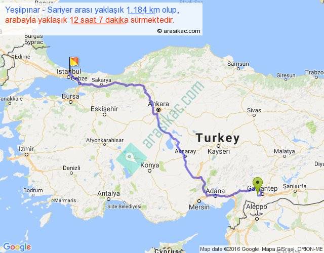 Yeşilpınar - Sariyer arası yaklaşık olarak 90 km/h ile yukarıda belirtilen sürede olup, iki yerin kuş uçuşu uzaklığı (mesafesi) 835'dir. Eğer belirtilen yerler arasında uçak seferi var ise bu süre uçakla 1 saat 17 dakika'ya kadar düşebilir. Yolculuk otobüsle 15 saat 45 dakika sürmektedir.