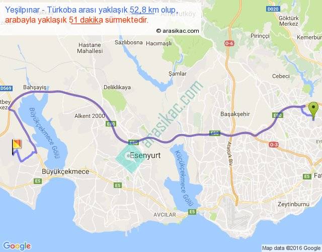 Yeşilpınar - Türkoba arası yaklaşık olarak 90 km/h ile yukarıda belirtilen sürede olup, iki yerin kuş uçuşu uzaklığı (mesafesi) 34'dir. Yolculuk otobüsle 1 saat 6 dakika sürmektedir.