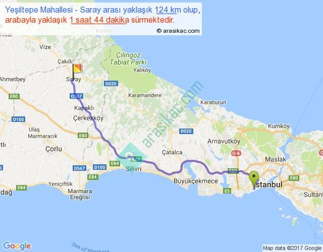 Yeşiltepe Mahallesi - Saray arası yaklaşık olarak 90 km/h ile yukarıda belirtilen sürede olup, iki yerin kuş uçuşu uzaklığı (mesafesi) 96'dir. Yolculuk otobüsle 2 saat 15 dakika sürmektedir.