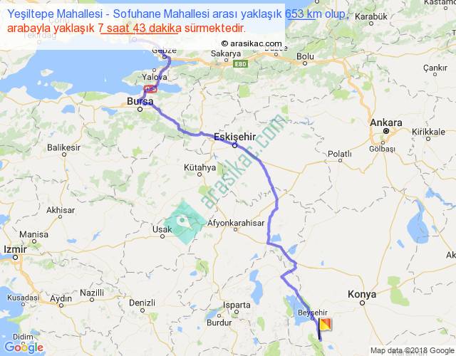 Yeşiltepe Mahallesi - Sofuhane Mahallesi arası yaklaşık olarak 90 km/h ile yukarıda belirtilen sürede olup, iki yerin kuş uçuşu uzaklığı (mesafesi) 468'dir. Eğer belirtilen yerler arasında uçak seferi var ise bu süre uçakla 43 dakika'ya kadar düşebilir. Yolculuk otobüsle 10 saat 1 dakika sürmektedir.