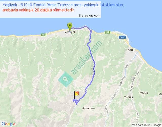 Yeşilyalı - 61910 Fındıklı Arsin Trabzon arası yaklaşık olarak 90 km/h ile yukarıda belirtilen sürede olup, iki yerin kuş uçuşu uzaklığı (mesafesi) 8'dir. Yolculuk otobüsle 26 dakika sürmektedir.