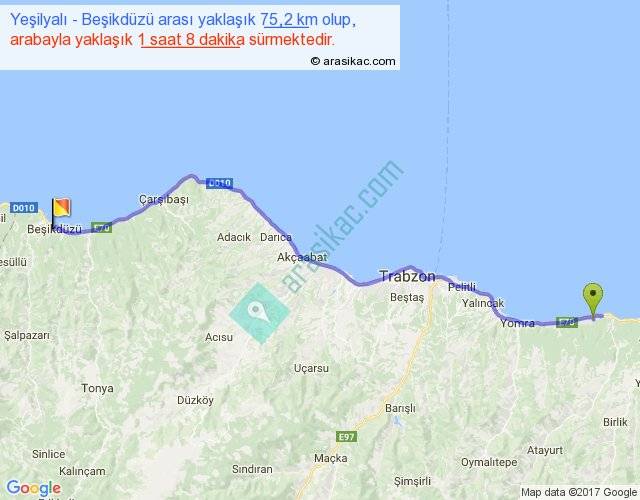 Yeşilyalı - Beşikdüzü arası yaklaşık olarak 90 km/h ile yukarıda belirtilen sürede olup, iki yerin kuş uçuşu uzaklığı (mesafesi) 63'dir. Yolculuk otobüsle 1 saat 28 dakika sürmektedir.
