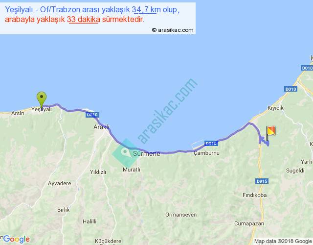Yeşilyalı - Of Trabzon arası yaklaşık olarak 90 km/h ile yukarıda belirtilen sürede olup, iki yerin kuş uçuşu uzaklığı (mesafesi) 27'dir. Yolculuk otobüsle 42 dakika sürmektedir.