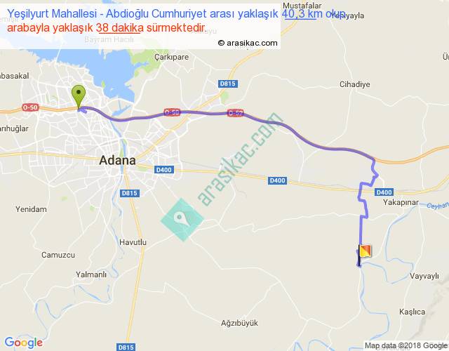 Yeşilyurt Mahallesi - Abdioğlu Cumhuriyet arası yaklaşık olarak 90 km/h ile yukarıda belirtilen sürede olup, iki yerin kuş uçuşu uzaklığı (mesafesi) 28'dir. Yolculuk otobüsle 49 dakika sürmektedir.