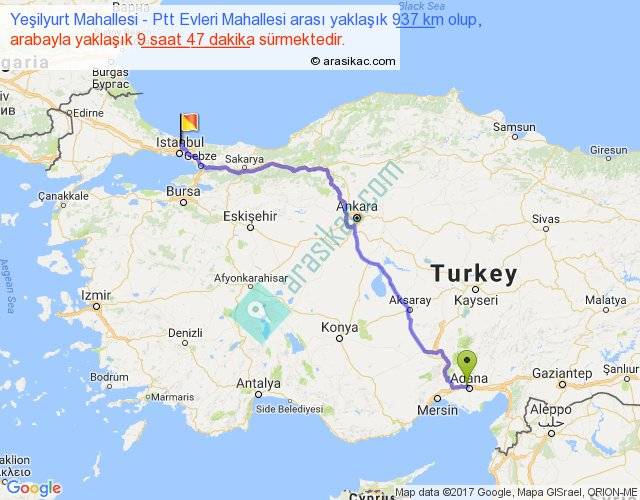 Yeşilyurt Mahallesi - Ptt Evleri Mahallesi arası yaklaşık olarak 90 km/h ile yukarıda belirtilen sürede olup, iki yerin kuş uçuşu uzaklığı (mesafesi) 705'dir. Eğer belirtilen yerler arasında uçak seferi var ise bu süre uçakla 1 saat 05 dakika'ya kadar düşebilir. Yolculuk otobüsle 12 saat 43 dakika sürmektedir.