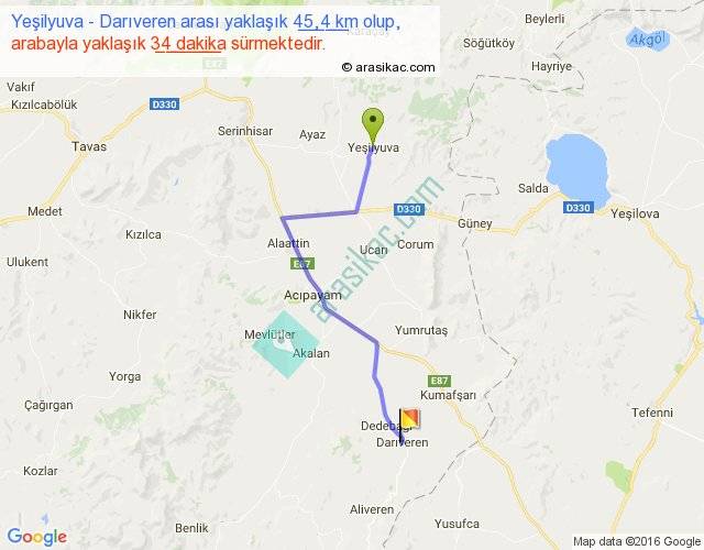 Yeşilyuva - Darıveren arası yaklaşık olarak 90 km/h ile yukarıda belirtilen sürede olup, iki yerin kuş uçuşu uzaklığı (mesafesi) 33'dir. Yolculuk otobüsle 44 dakika sürmektedir.