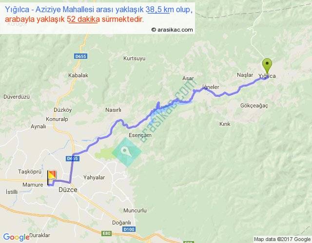 Yığılca - Aziziye Mahallesi arası yaklaşık olarak 90 km/h ile yukarıda belirtilen sürede olup, iki yerin kuş uçuşu uzaklığı (mesafesi) 29'dir. Yolculuk otobüsle 1 saat 7 dakika sürmektedir.