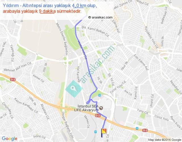 Yıldırım - Altıntepsi arası yaklaşık olarak 90 km/h ile yukarıda belirtilen sürede olup, iki yerin kuş uçuşu uzaklığı (mesafesi) 3'dir. Yolculuk otobüsle 11 dakika sürmektedir.