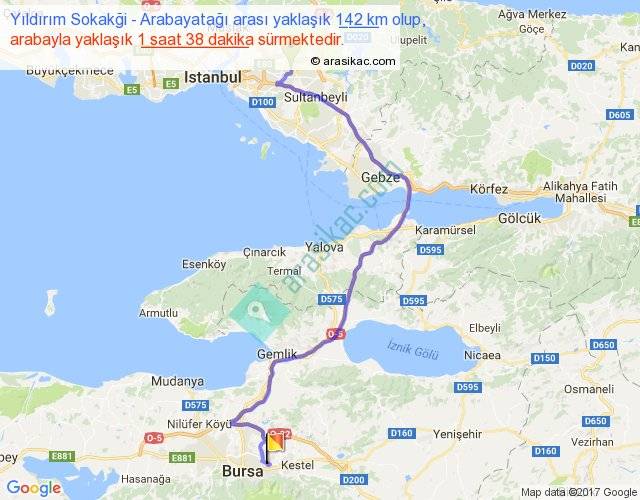 Yıldırım Sokakği - Arabayatağı arası yaklaşık olarak 90 km/h ile yukarıda belirtilen sürede olup, iki yerin kuş uçuşu uzaklığı (mesafesi) 91'dir. Yolculuk otobüsle 2 saat 7 dakika sürmektedir.