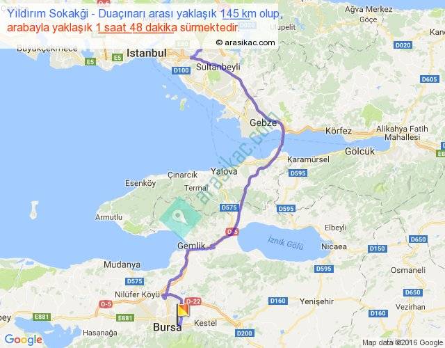 Yıldırım Sokakği - Duaçınarı arası yaklaşık olarak 90 km/h ile yukarıda belirtilen sürede olup, iki yerin kuş uçuşu uzaklığı (mesafesi) 92'dir. Yolculuk otobüsle 2 saat 20 dakika sürmektedir.