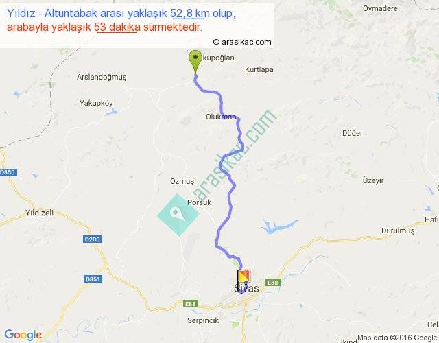 Yıldız - Altuntabak arası yaklaşık olarak 90 km/h ile yukarıda belirtilen sürede olup, iki yerin kuş uçuşu uzaklığı (mesafesi) 37'dir. Yolculuk otobüsle 1 saat 8 dakika sürmektedir.