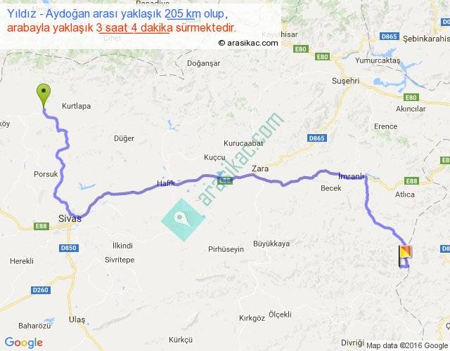 Yıldız - Aydoğan arası yaklaşık olarak 90 km/h ile yukarıda belirtilen sürede olup, iki yerin kuş uçuşu uzaklığı (mesafesi) 129'dir. Yolculuk otobüsle 3 saat 59 dakika sürmektedir.