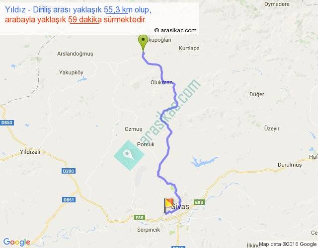 Yıldız - Diriliş arası yaklaşık olarak 90 km/h ile yukarıda belirtilen sürede olup, iki yerin kuş uçuşu uzaklığı (mesafesi) 38'dir. Yolculuk otobüsle 1 saat 16 dakika sürmektedir.