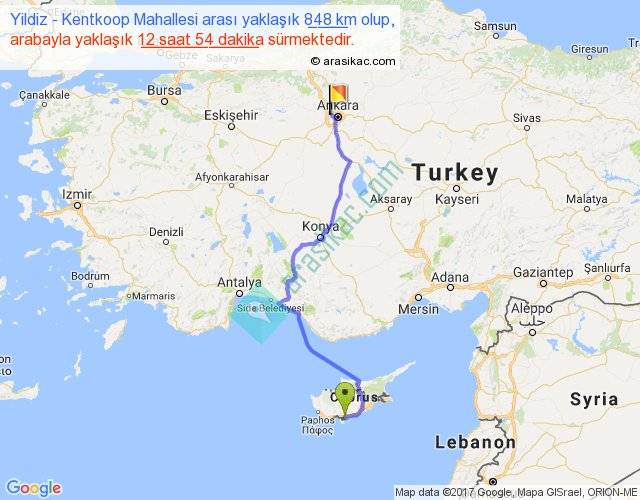 Yildiz - Kentkoop Mahallesi arası yaklaşık olarak 90 km/h ile yukarıda belirtilen sürede olup, iki yerin kuş uçuşu uzaklığı (mesafesi) 586'dir. Eğer belirtilen yerler arasında uçak seferi var ise bu süre uçakla 54 dakika'ya kadar düşebilir. Yolculuk otobüsle 16 saat 46 dakika sürmektedir.