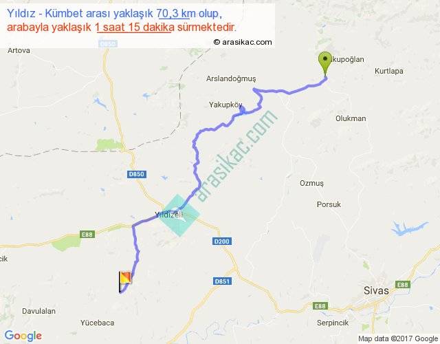 Yıldız - Kümbet arası yaklaşık olarak 90 km/h ile yukarıda belirtilen sürede olup, iki yerin kuş uçuşu uzaklığı (mesafesi) 50'dir. Yolculuk otobüsle 1 saat 37 dakika sürmektedir.