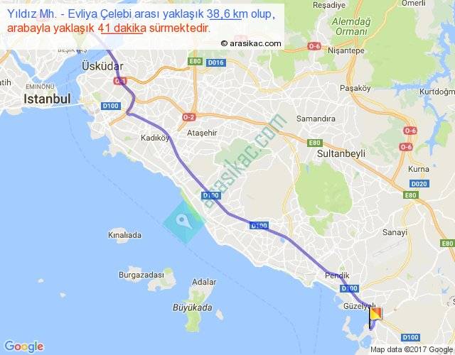 Yıldız Mh. - Evliya Çelebi arası yaklaşık olarak 90 km/h ile yukarıda belirtilen sürede olup, iki yerin kuş uçuşu uzaklığı (mesafesi) 32'dir. Yolculuk otobüsle 53 dakika sürmektedir.