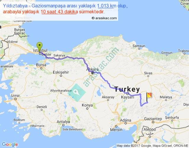 Yıldıztabya - Gaziosmanpaşa arası yaklaşık olarak 90 km/h ile yukarıda belirtilen sürede olup, iki yerin kuş uçuşu uzaklığı (mesafesi) 747'dir. Eğer belirtilen yerler arasında uçak seferi var ise bu süre uçakla 1 saat 08 dakika'ya kadar düşebilir. Yolculuk otobüsle 13 saat 55 dakika sürmektedir.