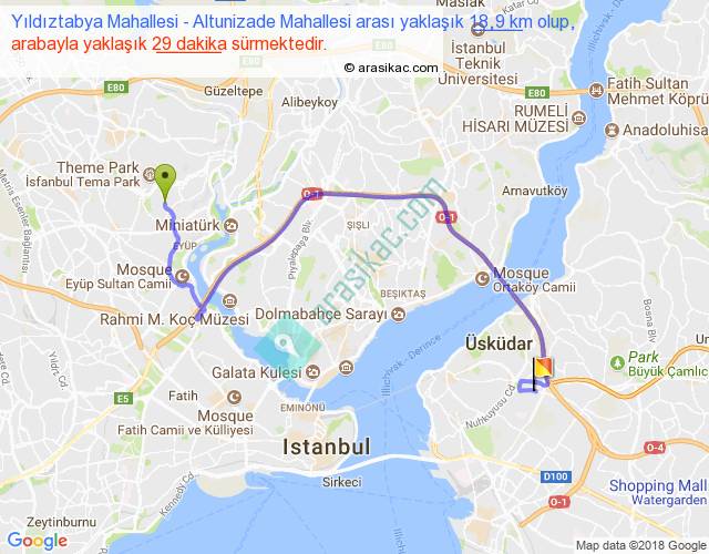 Yıldıztabya Mahallesi - Altunizade Mahallesi arası yaklaşık olarak 90 km/h ile yukarıda belirtilen sürede olup, iki yerin kuş uçuşu uzaklığı (mesafesi) 11'dir. Yolculuk otobüsle 37 dakika sürmektedir.