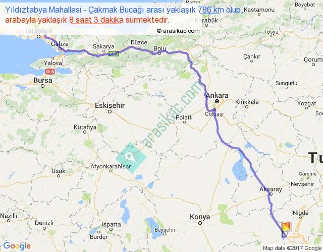 Yıldıztabya Mahallesi - Çakmak Bucağı arası yaklaşık olarak 90 km/h ile yukarıda belirtilen sürede olup, iki yerin kuş uçuşu uzaklığı (mesafesi) 595'dir. Eğer belirtilen yerler arasında uçak seferi var ise bu süre uçakla 54 dakika'ya kadar düşebilir. Yolculuk otobüsle 10 saat 27 dakika sürmektedir.
