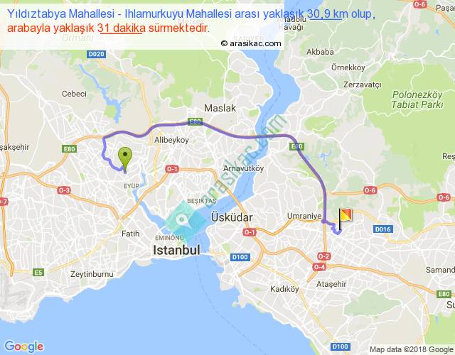 Yıldıztabya Mahallesi - Ihlamurkuyu Mahallesi arası yaklaşık olarak 90 km/h ile yukarıda belirtilen sürede olup, iki yerin kuş uçuşu uzaklığı (mesafesi) 18'dir. Yolculuk otobüsle 40 dakika sürmektedir.