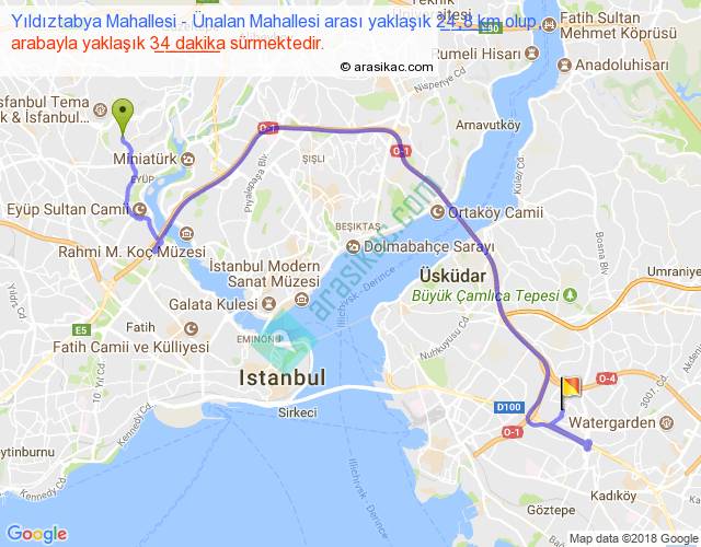 Yıldıztabya Mahallesi - Ünalan Mahallesi arası yaklaşık olarak 90 km/h ile yukarıda belirtilen sürede olup, iki yerin kuş uçuşu uzaklığı (mesafesi) 14'dir. Yolculuk otobüsle 44 dakika sürmektedir.