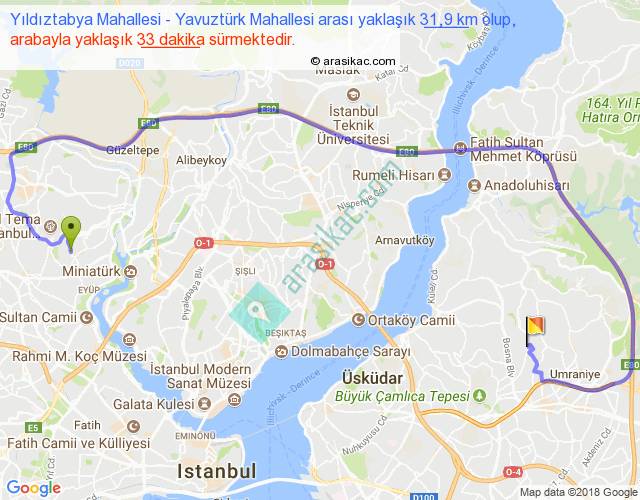 Yıldıztabya Mahallesi - Yavuztürk Mahallesi arası yaklaşık olarak 90 km/h ile yukarıda belirtilen sürede olup, iki yerin kuş uçuşu uzaklığı (mesafesi) 13'dir. Yolculuk otobüsle 42 dakika sürmektedir.