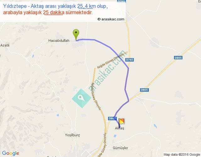 Yıldıztepe - Aktaş arası yaklaşık olarak 90 km/h ile yukarıda belirtilen sürede olup, iki yerin kuş uçuşu uzaklığı (mesafesi) 19'dir. Yolculuk otobüsle 32 dakika sürmektedir.