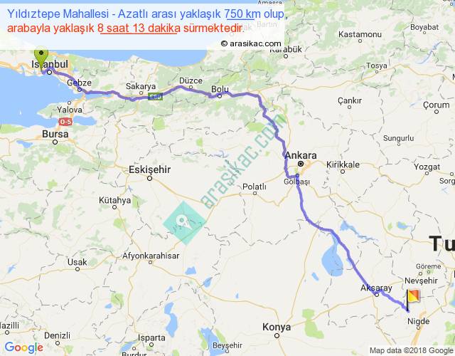 Yıldıztepe Mahallesi - Azatlı arası yaklaşık olarak 90 km/h ile yukarıda belirtilen sürede olup, iki yerin kuş uçuşu uzaklığı (mesafesi) 576'dir. Eğer belirtilen yerler arasında uçak seferi var ise bu süre uçakla 53 dakika'ya kadar düşebilir. Yolculuk otobüsle 10 saat 40 dakika sürmektedir.