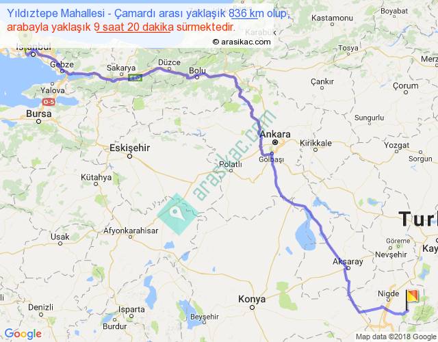 Yıldıztepe Mahallesi - Çamardı arası yaklaşık olarak 90 km/h ile yukarıda belirtilen sürede olup, iki yerin kuş uçuşu uzaklığı (mesafesi) 631'dir. Eğer belirtilen yerler arasında uçak seferi var ise bu süre uçakla 58 dakika'ya kadar düşebilir. Yolculuk otobüsle 12 saat 8 dakika sürmektedir.