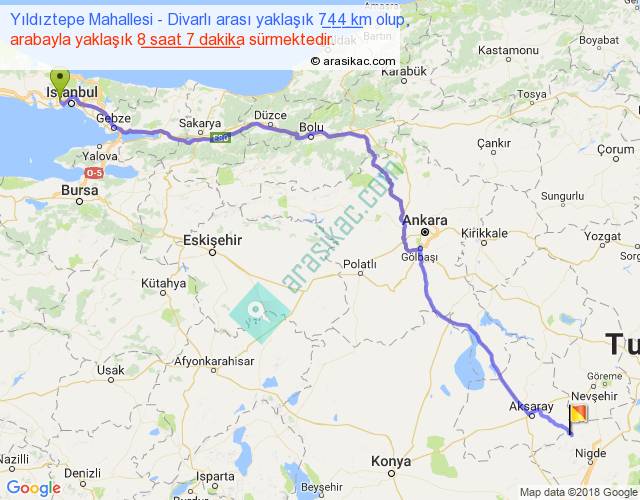 Yıldıztepe Mahallesi - Divarlı arası yaklaşık olarak 90 km/h ile yukarıda belirtilen sürede olup, iki yerin kuş uçuşu uzaklığı (mesafesi) 570'dir. Eğer belirtilen yerler arasında uçak seferi var ise bu süre uçakla 52 dakika'ya kadar düşebilir. Yolculuk otobüsle 10 saat 33 dakika sürmektedir.