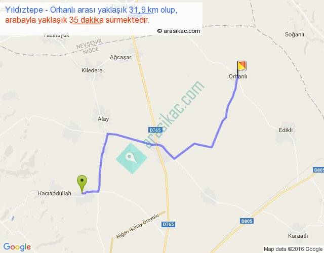 Yıldıztepe - Orhanlı arası yaklaşık olarak 90 km/h ile yukarıda belirtilen sürede olup, iki yerin kuş uçuşu uzaklığı (mesafesi) 23'dir. Yolculuk otobüsle 45 dakika sürmektedir.