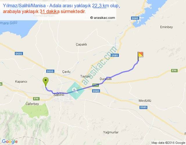 Yılmaz Salihli Manisa - Adala arası yaklaşık olarak 90 km/h ile yukarıda belirtilen sürede olup, iki yerin kuş uçuşu uzaklığı (mesafesi) 20'dir. Yolculuk otobüsle 40 dakika sürmektedir.