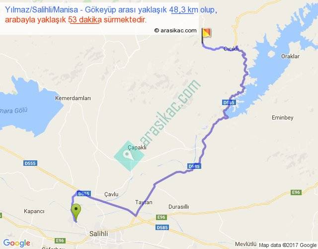 Yılmaz Salihli Manisa - Gökeyüp arası yaklaşık olarak 90 km/h ile yukarıda belirtilen sürede olup, iki yerin kuş uçuşu uzaklığı (mesafesi) 26'dir. Yolculuk otobüsle 1 saat 8 dakika sürmektedir.