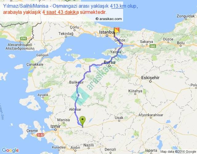 Yılmaz Salihli Manisa - Osmangazi arası yaklaşık olarak 90 km/h ile yukarıda belirtilen sürede olup, iki yerin kuş uçuşu uzaklığı (mesafesi) 291'dir. Eğer belirtilen yerler arasında uçak seferi var ise bu süre uçakla 26 dakika'ya kadar düşebilir. Yolculuk otobüsle 6 saat 7 dakika sürmektedir.