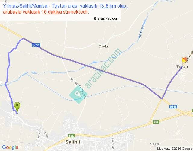 Yılmaz Salihli Manisa - Taytan arası yaklaşık olarak 90 km/h ile yukarıda belirtilen sürede olup, iki yerin kuş uçuşu uzaklığı (mesafesi) 8'dir. Yolculuk otobüsle 20 dakika sürmektedir.