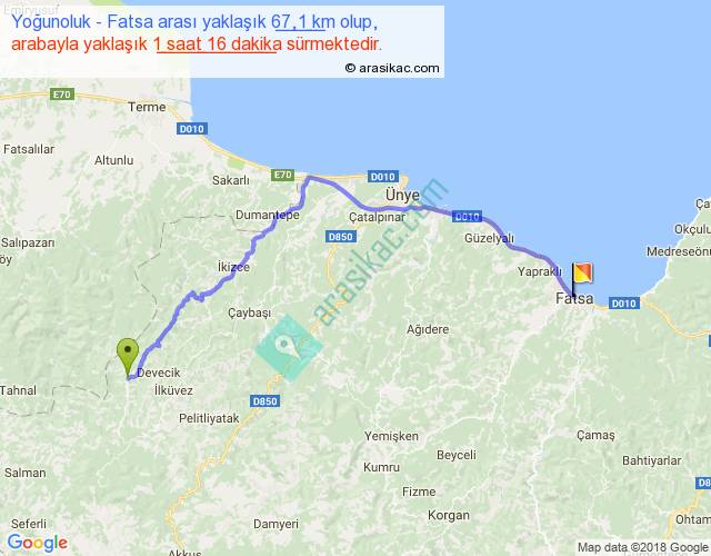 Yoğunoluk - Fatsa arası yaklaşık olarak 90 km/h ile yukarıda belirtilen sürede olup, iki yerin kuş uçuşu uzaklığı (mesafesi) 47'dir. Yolculuk otobüsle 1 saat 38 dakika sürmektedir.
