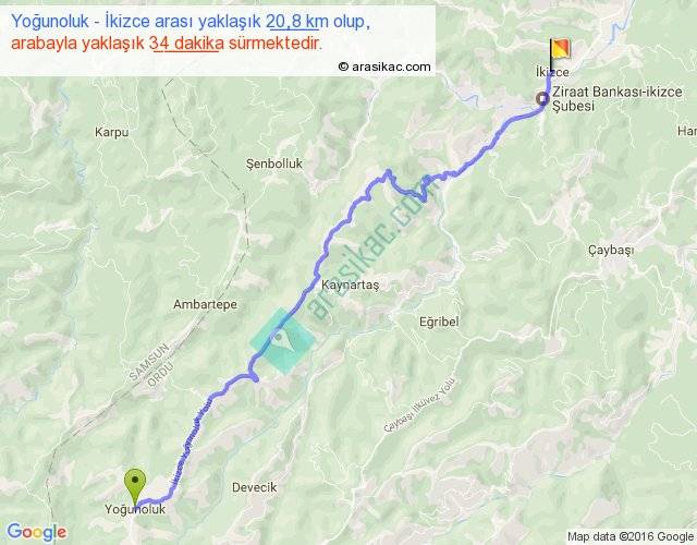 Yoğunoluk - İkizce arası yaklaşık olarak 90 km/h ile yukarıda belirtilen sürede olup, iki yerin kuş uçuşu uzaklığı (mesafesi) 16'dir. Yolculuk otobüsle 44 dakika sürmektedir.