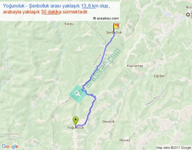 Yoğunoluk - Şenbolluk arası yaklaşık olarak 90 km/h ile yukarıda belirtilen sürede olup, iki yerin kuş uçuşu uzaklığı (mesafesi) 10'dir. Yolculuk otobüsle 39 dakika sürmektedir.
