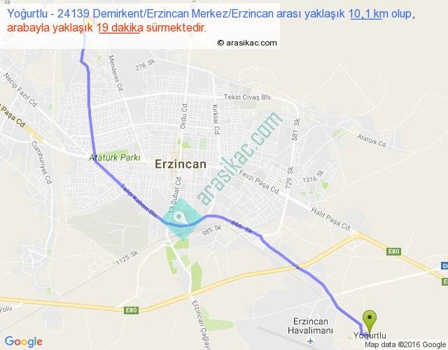 Yoğurtlu - 24139 Demirkent Erzincan Merkez Erzincan arası yaklaşık olarak 90 km/h ile yukarıda belirtilen sürede olup, iki yerin kuş uçuşu uzaklığı (mesafesi) 9'dir. Yolculuk otobüsle 24 dakika sürmektedir.