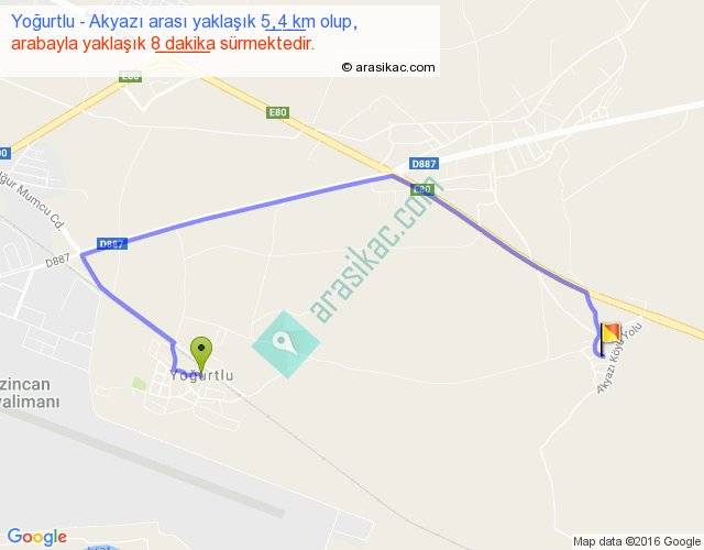 Yoğurtlu - Akyazı arası yaklaşık olarak 90 km/h ile yukarıda belirtilen sürede olup, iki yerin kuş uçuşu uzaklığı (mesafesi) 3'dir. Yolculuk otobüsle 10 dakika sürmektedir.