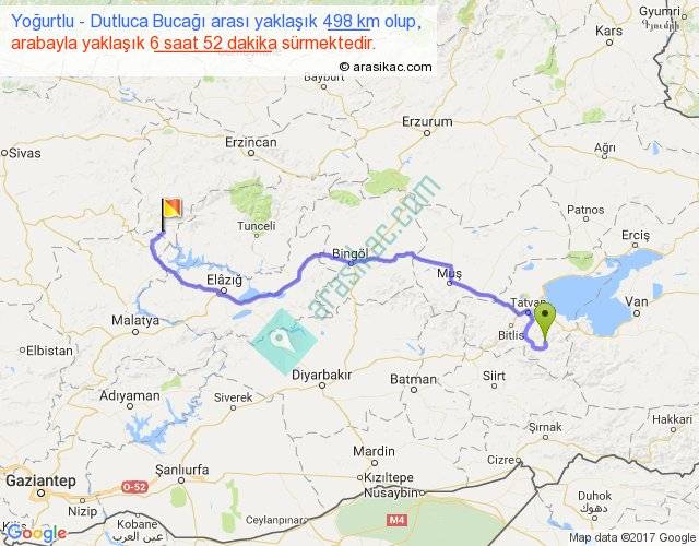 Yoğurtlu - Dutluca Bucağı arası yaklaşık olarak 90 km/h ile yukarıda belirtilen sürede olup, iki yerin kuş uçuşu uzaklığı (mesafesi) 345'dir. Eğer belirtilen yerler arasında uçak seferi var ise bu süre uçakla 31 dakika'ya kadar düşebilir. Yolculuk otobüsle 8 saat 55 dakika sürmektedir.
