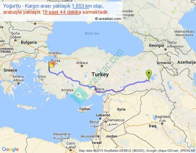 Yoğurtlu - Kargın arası yaklaşık olarak 90 km/h ile yukarıda belirtilen sürede olup, iki yerin kuş uçuşu uzaklığı (mesafesi) 1233'dir. Eğer belirtilen yerler arasında uçak seferi var ise bu süre uçakla 1 saat 53 dakika'ya kadar düşebilir. Yolculuk otobüsle 1 gün 1 saat sürmektedir.