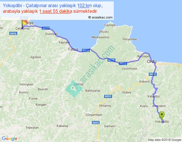 Yokuşdibi - Çatalpınar arası yaklaşık olarak 90 km/h ile yukarıda belirtilen sürede olup, iki yerin kuş uçuşu uzaklığı (mesafesi) 68'dir. Yolculuk otobüsle 2 saat 29 dakika sürmektedir.