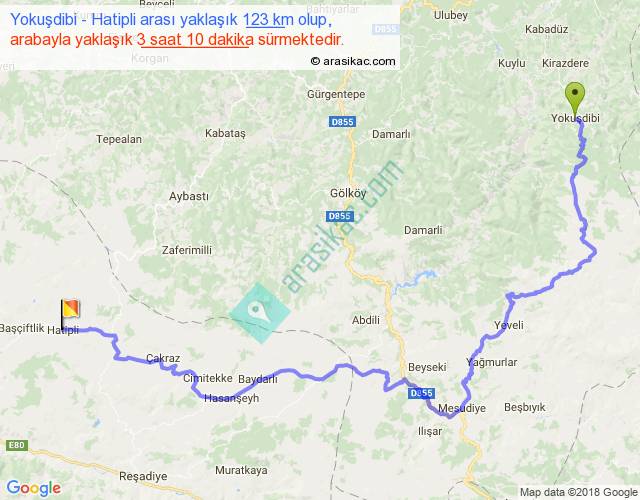 Yokuşdibi - Hatipli arası yaklaşık olarak 90 km/h ile yukarıda belirtilen sürede olup, iki yerin kuş uçuşu uzaklığı (mesafesi) 64'dir. Yolculuk otobüsle 4 saat 7 dakika sürmektedir.