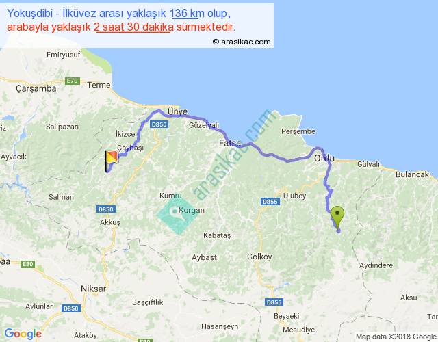 Yokuşdibi - İlküvez arası yaklaşık olarak 90 km/h ile yukarıda belirtilen sürede olup, iki yerin kuş uçuşu uzaklığı (mesafesi) 80'dir. Yolculuk otobüsle 3 saat 15 dakika sürmektedir.